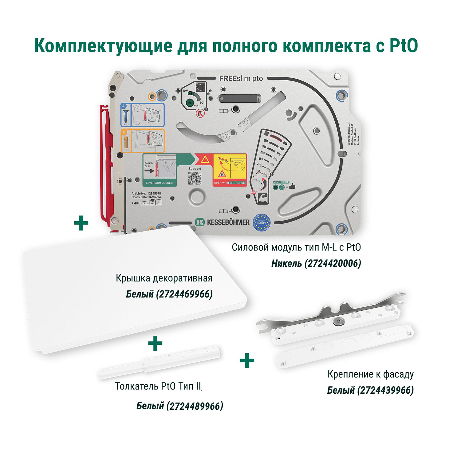 Полный комплект подъемного механизма ФриСлим ФЛАП c толкателем PTO тип II для накладного монтажа, цвет БЕЛЫЙ Kessebohmer | официальный магазин