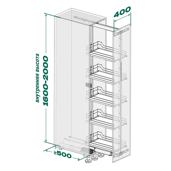 • Высокая нагрузка на механизм в 100 кг (по 18 кг на полку) позволяет организовать хранение большому количеству предметов, при этом даже при полной загрузке система выдвигается легко.